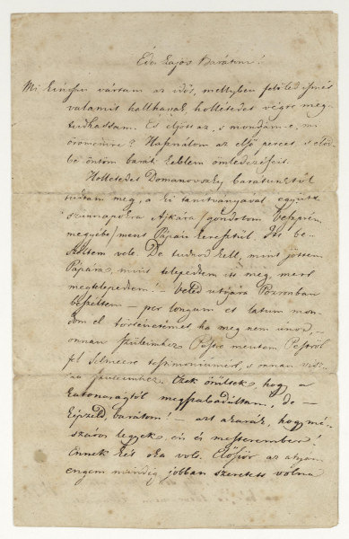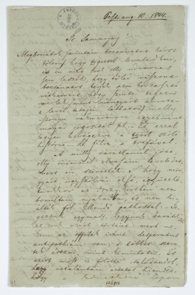 A tréfálkozó levélkezdet után Petőfi több, éppen aktuális eseményt említ meg ügyvéd és költő ismerősének, Samarjay Károlynak (1821–1894). Többek között első verseskötete, a Versek 1842–1844 (Pest, 1844) kiadásának előkészületeiről számol be, végül még költészeti tanácsokkal is megtoldja sorait. Samarjay Károllyal való levelezésüknek ez az egyetlen megmaradt darabja. A címzés, bélyegző, pecsét és boríték nélküli levelet a Samarjay-család ajándékozta 1922-ben a Petőfi Társaságnak.