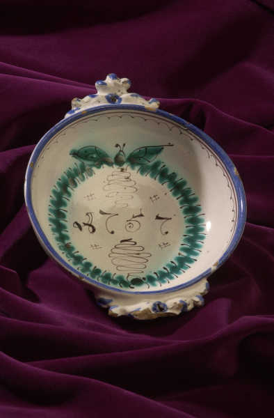 Kerek, mély, fehér mázas habán fajansz tálka. A középső feliratot (1757) zöld színű sávos minta veszi körül, a perem festése kék. A tálnak felső és alsó részén fülszerű, háromszög alakú, virágmintás fogója van, egy-egy lyukkal a felfüggesztéshez.