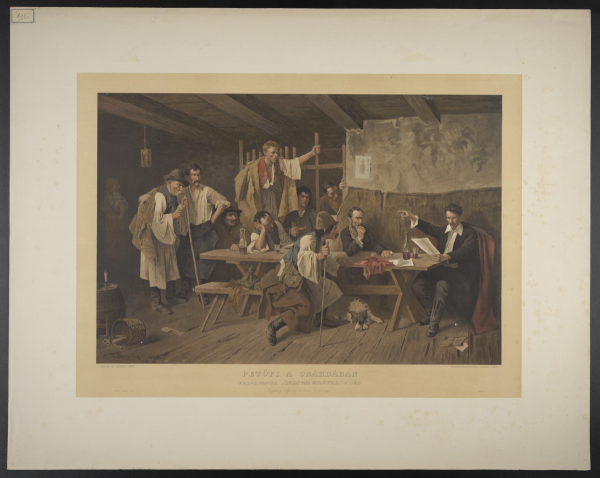 A grafikán látható jeleneten Petőfi Sándor éppen a forradalom legikonikusabb versét, a Nemzeti dalt szavalja. A körülötte ülők feszült figyelemmel hallgatják a költeményt. A rajzot készítő művész, Révész Imre előszeretettel festett történeti témájú képeket. Nem csoda, hogy e témát kedvelte, hiszen mesterei Székely Bertalan és Munkácsy Mihály voltak. Munkácsy olyannyira nagy hatással volt rá, hogy Mukácsy-ösztöndíjat is nyert. A Petőfit ábrázoló kocsmai zsánerképe is megidézi a festőfejedelem Siralomház című képének kompozíciós megoldásait.