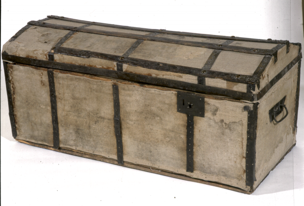 A láda téglatest alakú, fedele enyhén domború, fából készült. Fölső részét hátul három bőrdarab rögzíti az alsó rész pereméhez. Kívül a ládát eredetileg viaszosvászon borította. A restaurálás során az eredeti darabokat zsákvászonra dolgozták rá. A textilborítást az éleken, peremeken három, a ládán keresztbefutó, szegecselt vaspánt rögzíti. A ládán kétoldalt egy-egy vasfogó van. Elöl, jobboldalt egy kulccsal zárható vaszárat szereltek fel.