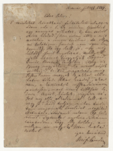 Petőfi említi – eredetileg mellékeli is – az Úti levelek Kerényi Frigyeshez című írásának első nyolc darabját. A címzés és boríték nélküli levél Kovács Pál örököseitől ajándékként került, Endrődi Sándor közvetítésével a Petőfi Házba.