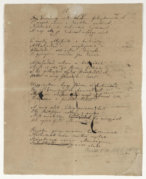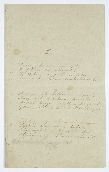 A kézirat A hazáról című vers tisztázatának második fele: a hatodiktól a tizenkettedik strófáig. A nyomtatott közlésben már elhagyott római számokkal való tagolás szerint a szöveg a II-vel kezdődik, alatta három szép, tisztázott írású versszakkal (a lap alján a halvány, ceruzaírású sor az utolsó előtti tisztázati sor végső változata, a sort Petőfi kicserélte). A folytatás – azaz a negyedik versszak – a lap hátoldalán, a bal felső részen olvasható. Jól látszik, hogy az ötödik versszakot is elkezdte leírni a költő, de már az ékezetet sem tette ki a szóra, a szöveget a szemközti, jobb oldalon a III. szám alatt folytatta három további versszakkal. A végső változatban az első versszak második sorát a felette látható ceruzaírású sorra cserélte, a második és a harmadik versszakot pedig kihúzta. A negyedik oldal felső részén egy negyedik áthúzott versszakot látunk, alatta pedig két fogalmazvány versszakot. A végső kiadásban ezekre cserélte le Petőfi a kihúzott hármat. Ilyen módon egymás mellett tanulmányozható az egy időben keletkezett tisztázó, fegyelmezett szépírás és a lendületesebb, energikus fogalmazóírás, azaz tanúi lehetünk egy vers formálódásának. A kéziratot Dömötör Bertalan dömsödi református lelkész felesége, Keresztes Teréz ajándékozta a Petőfi Társaságnak az 1900-as évek elején.