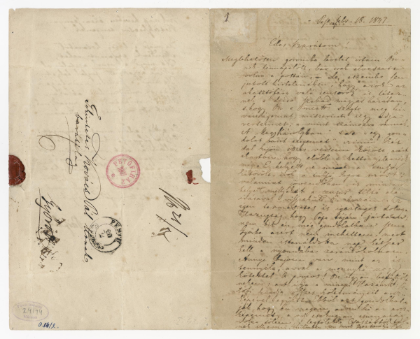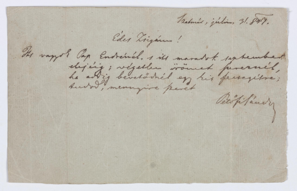 Benedekfalvi Luby Zsigmond (1819–1887) jegyző, Szatmár vármegye főszolgabírája, királyi tanácsos, Petőfi szatmári baráti köréhez tartozott. A levélben említett Pap Endre (1817–1851), akinél a levél írásának idején Petőfi tartózkodott, jogász költő, országgyűlési követ volt. A levélnek két melléklete van, az első Pap Endre levele Luby Zsigmondnak, a másik Kondor Sándor tintaírású hitelesítő sorai egy szakadt borítékon. A kéziratot 1956-ban gyűjteményezte intézményünk Luby Zsigmond unokájától, Luby Margit (1885–1976) néprajzkutatótól 1956-ban.
