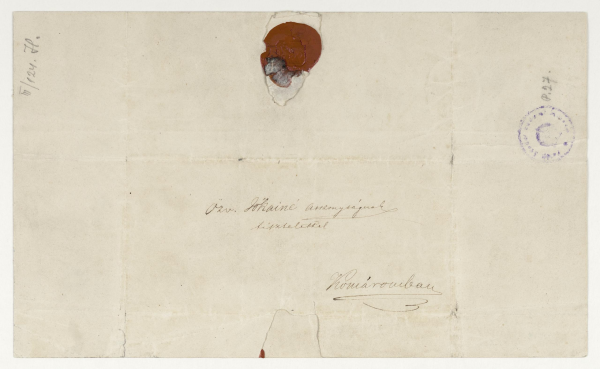 Az 1. fólió rektóján Darnay Kálmán tulajdonbélyegzője, tintaírású leltári számai; a kisérőlevél szövege át van húzva. A 2. fólió verzóján az egyik viaszpecséten P. S. monogram látható.