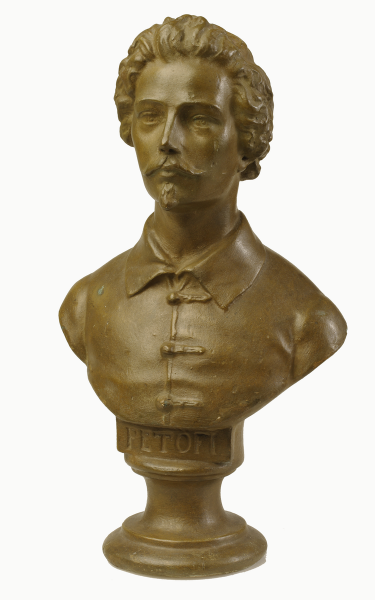 "A kis szobor kerek talpon áll, 34,5 cm magas, színezett gipsz. A hátán bekarcolt szignatúra szerint alkotója „Alekszi" és készülési éve 1850. Ez a dátum tanúsítja, hogy a Petőfiről készült első szobor áll előttünk, mely legalább tíz évvel megelőzi a Petőfi-ikonográfusok tanulmányaiban elsőnek ismertetett szoborműveket. Szobrunkon a költő a nézővel szembenéz, haja fölfelé fésült, vékony bajusza és keskeny francia szakálla van, ruhája csukott magyaros kabát, kihajtott inggallérral. Egyedi példány, nem sokszorosításból ránkmaradt darab."