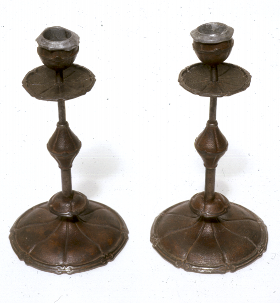 A XVIII. század végi osztrák gyertyatartók öt részből állnak. Az egyes darabokat cikkekre tagoló, mélyített, sziromszerű minta díszíti. A gyertyatartó felső tartórésze hosszúkás félgömb alakú, pereme szürke, kihajló. Alatta kerek, vastagított peremű csepegtető van. Alul, a talp fölött, levehető, félgömb formájú dísz van. A talp kerek, pereme vastag, díszített, enyhén domború. A gyertyatartókat pirosas-barnás festékkel kenték át.